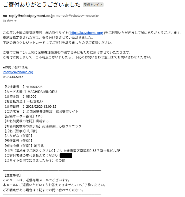 親のいない子供や虐待されている子供たちに微力ながら少しでも役立てば良いと思っており、「南浦和東口心療クリニック」では、定期的に売上の一部を埼玉県内の児童養護施設に寄付しています。